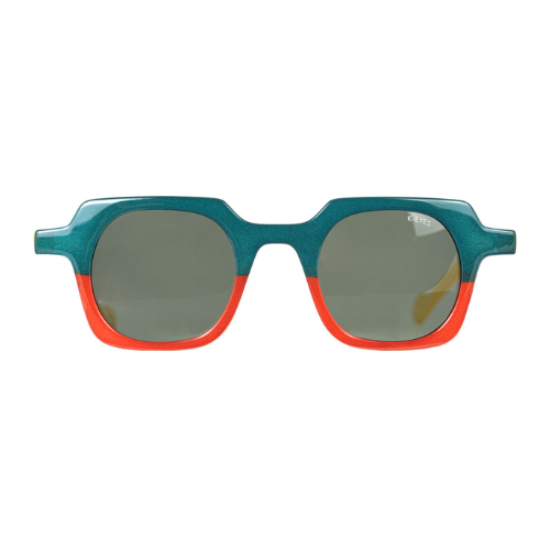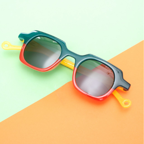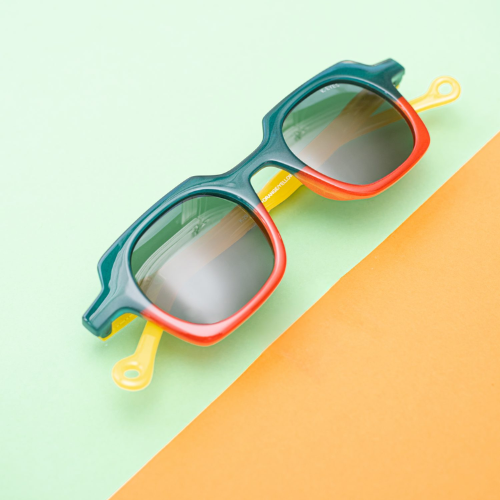 Gafa de lectura con montura cuadrada. La montura en 2 colores, verde y naranja, y la varilla en color amarillo.