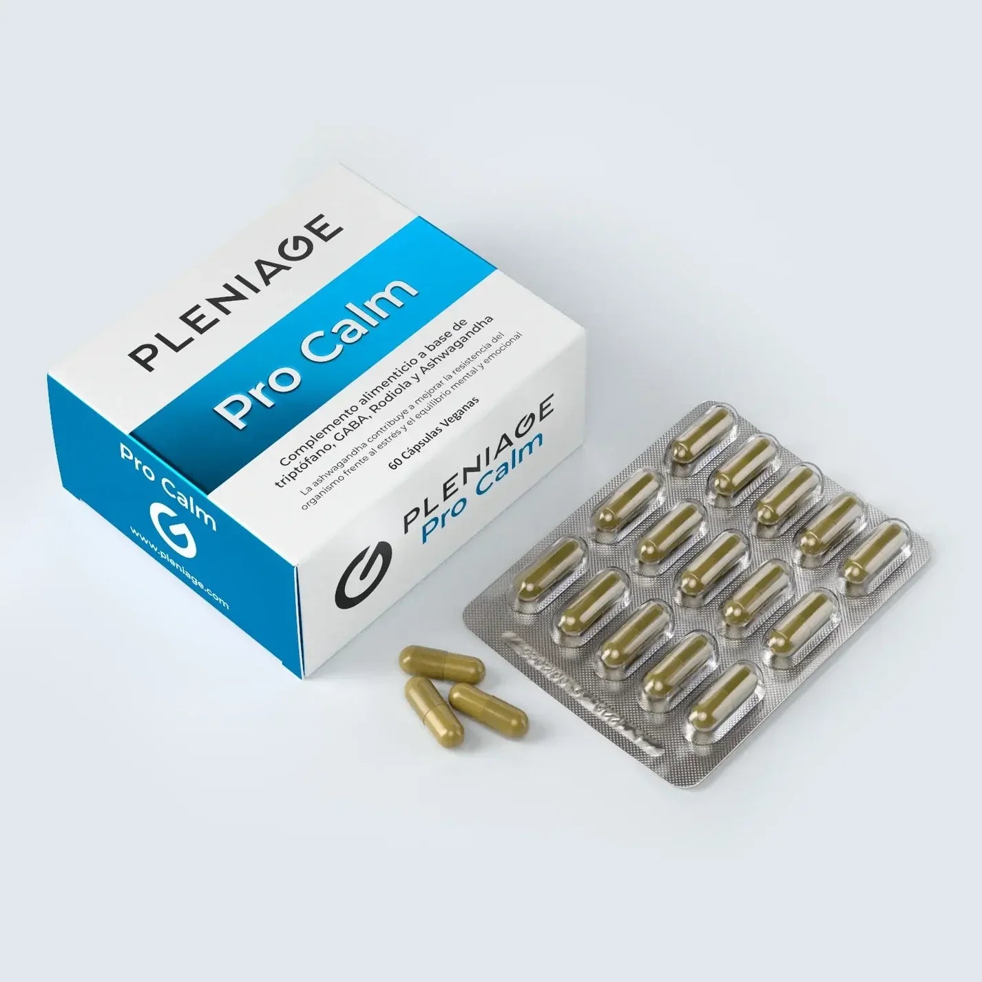 Pleniage Pro Calm 60 Cápsulas es un complemento alimenticio diseñado para integrarse fácilmente en la rutina diaria y acompañar a quienes buscan equilibrio y serenidad en su día a día. Su fórmula combina aminoácidos como L-Triptófano y GABA con extractos botánicos de ashwagandha (Withania somnifera) y rodiola (Rhodiola rosea), plantas adaptógenas tradicionalmente utilizadas para favorecer el bienestar mental y la adaptación al estrés. Una sinergia cuidada para simplificar tu ritual de bienestar sin perder el foco, disponible en Farmacia Malasaña.