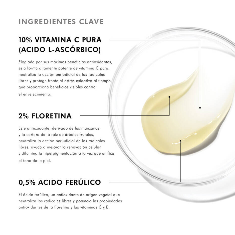 Sérum diario con 10% de vitamina C pura que proporciona protección ambiental avanzada y reduce la hiperpigmentación de la piel y las líneas de expresión, mejorando el tono y suavidad de la piel.