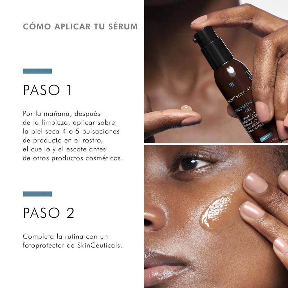 Phloretin CF gel es un antioxidante revolucionario con una tecnología que combina un 2 % de floretina, un 10 % de vitamina C pura (ácido L-ascórbico) y un 0,5 % de ácido ferúlico para brindar una protección reforzada frente al envejecimiento de la piel por causas atmosféricas: deterioro ambiental y signos prematuros del envejecimiento como consecuencia de los radicales libres procedentes de la radiación UVA/UVB. Este antioxidante tópico diario con vitamina C también ayuda a disminuir la apariencia de la hiperpigmentación, afina la textura de la piel y mejora el tono de la piel.Proporciona protección ambiental avanzada neutralizando la acción perjudicial de los radicales libresDisminuye el aspecto de la hiperpigmentación y afina la texturaTextura suave en gel reconfortante, ideal para la piel normal, grasa y mixtaBien tolerado por los hombres después del afeitado.