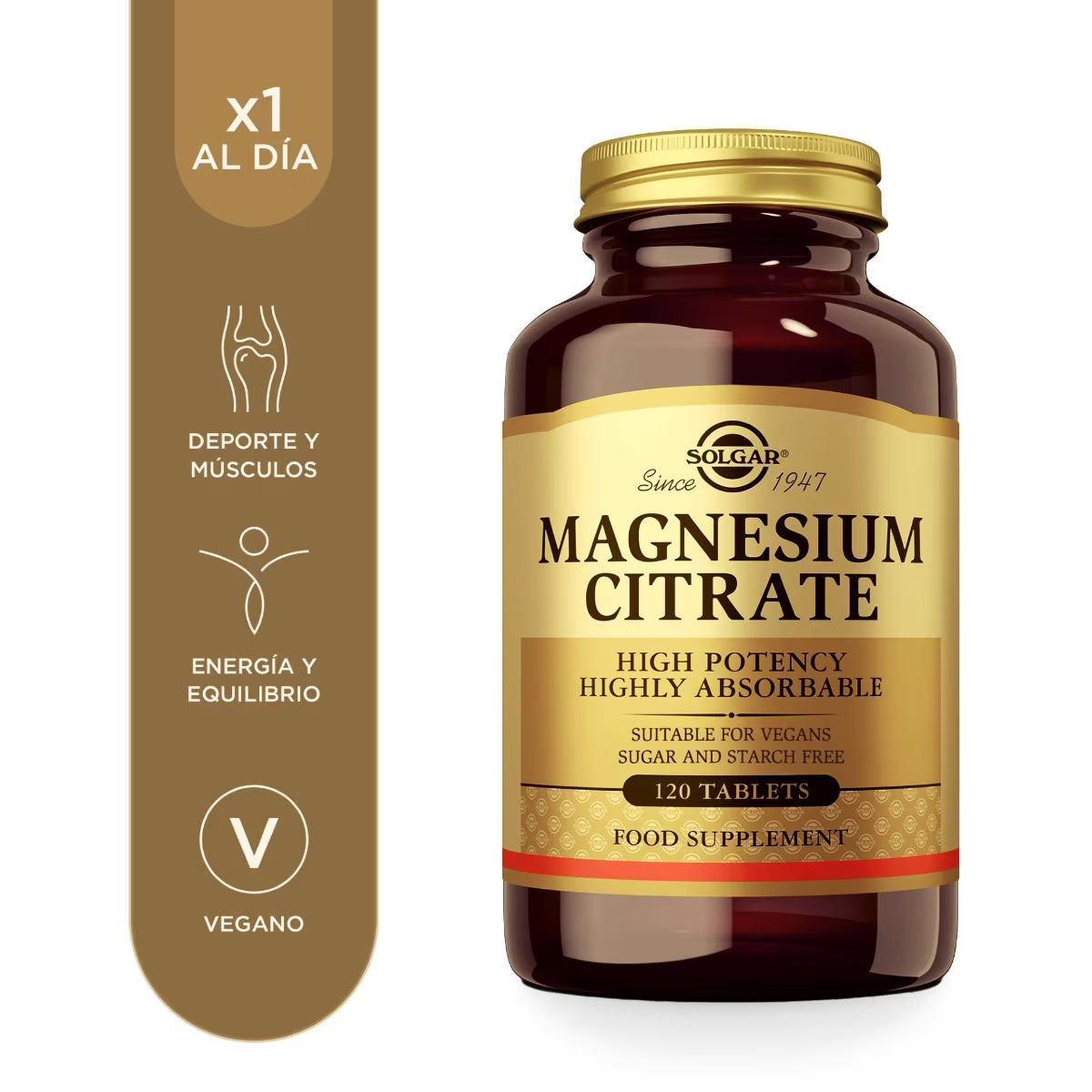 Solgar Citrato de Magnesio es un complemento alimenticio formulado para ofrecer una forma de magnesio altamente biodisponible y de fácil absorción. El magnesio es un mineral esencial que interviene en más de 300 procesos biológicos, incluyendo la función muscular, nerviosa y el mantenimiento de huesos y dientes en condiciones normales. También contribuye a reducir el cansancio y la fatiga, siendo especialmente útil en épocas de estrés, actividad física intensa o falta de energía.